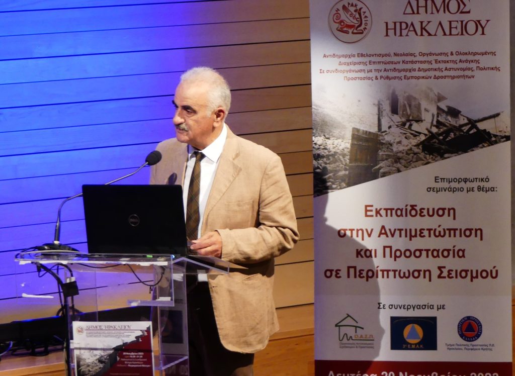 Με μεγάλη επιτυχία και με μαζική συμμετοχή κόσμου ολοκληρώθηκε τη Δευτέρα 20 Νοεμβρίου 2023, στο Πολιτιστικό και Συνεδριακό Κέντρο Ηρακλείου, το Επιμορφωτικό Σεμινάριο με θέμα «Εκπαίδευση στην Αντιμετώπιση και Προστασία σε Περίπτωση Σεισμού». Το σεμινάριο διοργανώθηκε σε συνεργασία με τον Οργανισμό Αντισεισμικού Σχεδιασμού και Προστασίας (Ο.Α.Σ.Π.), την Ειδική Μονάδα Αντιμετώπισης Καταστροφών (Ε.Μ.Α.Κ.) και το Τμήμα Πολιτικής Προστασίας Π.Ε. Ηρακλείου – Περιφέρειας Κρήτης.