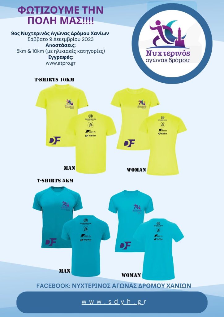 Ο Σύλλογος Δρομέων Υγείας Χανίων (Σ.Δ.Υ.Χ) σε συνεργασία με την Περιφέρεια Κρήτης / Region of Crete, την Περιφερειακή Ενότητα Χανίων, τον Δήμος Χανίων – Municipality of Chania, και την Ε.Α.Σ. Σ.Ε.Γ.Α.Σ. Κρήτης διοργανώνει το Σάββατο 09 /12 /2023 τον 9ο Νυκτερινό Αγώνα Δρόμου Χανίων, με τη συμμετοχή (ρεκόρ) 900 δρομέων.