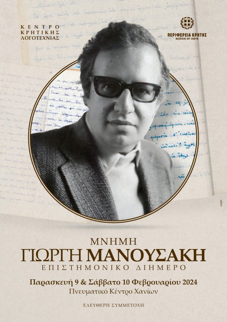 Το Κέντρο Κρητικής Λογοτεχνίας και η Περιφέρεια Κρήτης / Region of Crete-Περιφερειακή Ενότητα Χανίων, θέλοντας να τιμήσουν τη Μνήμη του Γιώργη Μανουσάκη, ποιητή, κριτικού, πεζογράφου και επιφυλλιδογράφου, οργανώνουν επιστημονικό διήμερο στο Πνευματικό Κέντρο Χανίων, την Παρασκευή 9 και το Σάββατο 10 Φεβρουαρίου 2024.