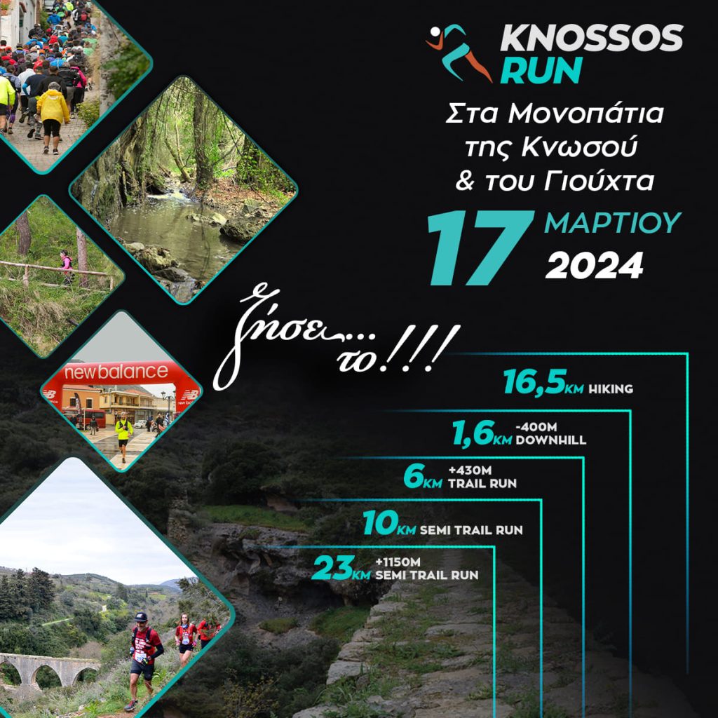 Ο Σύλλογος Μαραθωνοδρόμων Κρήτης- ΙΚΑΡΟΣ προκηρύσσει τον 9ο ημιορεινό αγώνα «Στα μονοπάτια της Κνωσού & του Γιούχτα» την Κυριακή 17 Μαρτίου 2024. Με χαρά διοργανώνει τον αγαπημένο ημιορεινό αγώνα που γίνεται για 9η χρονιά και έχει καθιερωθεί ως ένας από τους σημαντικούς αγώνες ημιορεινού τρεξίματος στην Κρήτη και στην Ελλάδα γενικότερα. Με στόχο την ανάδειξη της φυσικής ομορφιάς του όρους Γιούχτα, αλλά και της ιστορικής και πολιτιστικής κληρονομιάς μας, την ανάπτυξη του αθλητικού τουρισμού και την προαγωγή του «ευ αγωνίσθαι», ο σύλλογος ευελπιστεί να αφυπνίσει τους αθλητές και φυσιολάτρεις του τόπου μας.