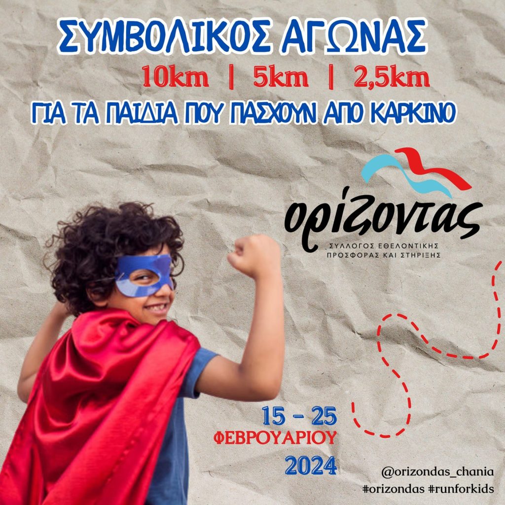 Ο «Σύλλογος Ορίζοντας / Sillogos Orizondas» με αφορμή την Παγκόσμια Ημέρα κατά του Παιδικού Καρκίνου διοργανώνει Συμβολικό Αγώνα Δρόμου – Δυναμικού Περπατήματος αποστάσεων 2,5χλμ, 5χλμ και 10χλμ, για μικρούς και μεγάλους! Η συμμετοχή είναι δωρεάν και αποκλειστικά αφιερωμένη στους μικρούς αυτούς ήρωες που δίνουν καθημερινά τον δικό τους αγώνα.