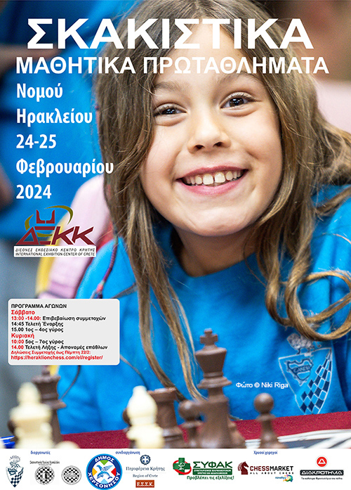 Ο καθιερωμένος σκακιστικός θεσμός των μαθητικών πρωταθλημάτων Π.Ε. Ηρακλείου θα πραγματοποιηθεί το Σάββατο 24 και την Κυριακή 25 Φεβρουαρίου στο Διεθνές Εκθεσιακό Κέντρο Κρήτης, στις Γούρνες. Πρόκειται για τη μαζικότερη και σημαντικότερη αναπτυξιακή σκακιστική διοργάνωση – που φέτος πραγματοποιείται για 20η χρονιά. Η συμμετοχή αναμένεται να φτάσει στα 500 παιδιά ηλικίας από νηπιαγωγείο έως και Γ’ Λυκείου (11 ηλικιακές κατηγορίες). Αποτελεί την προκριματική φάση του Παγκρήτιου και, εν συνεχεία, του Πανελληνίου Πρωταθλήματος.