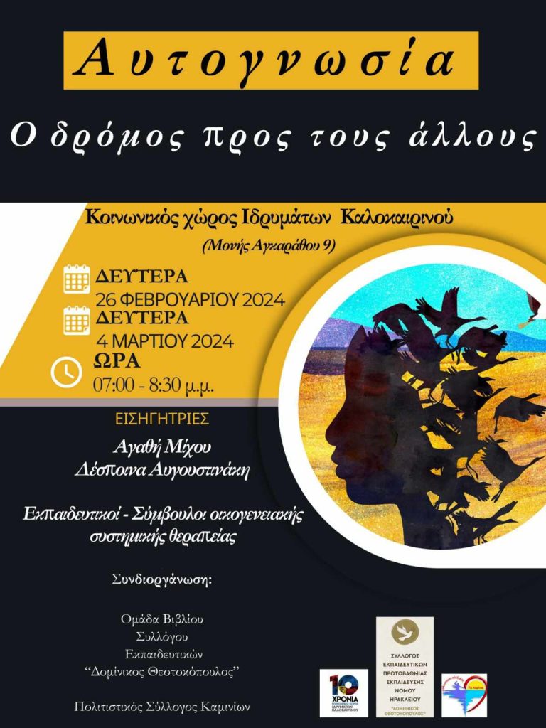 Για δύο συνεχόμενες Δευτέρες (26/02 & 04/03/2024) ο Κοινωνικός Χώρος των Ιδρυμάτων Α. & Μ. Καλοκαιρινού, σε συνεργασία με την “Ομάδα Βιβλίου”, τον Σύλλογο Εκπαιδευτικών Π.Ε. Ηρακλείου “Δομήνικος Θεοτοκόπουλος” και τον Πολιτιστικός Σύλλογος Καμινίων παρουσιάζει την σειρά σεμιναρίων: “Αυτογνωσία: Ο Δρόμος προς τους Άλλους”.