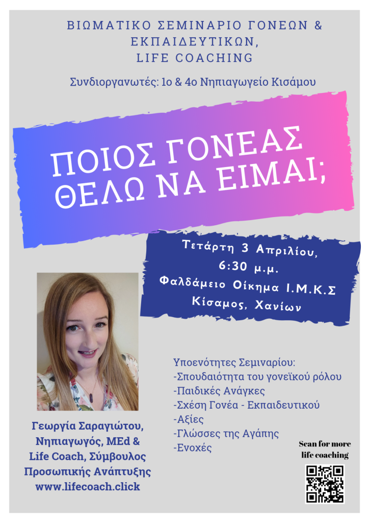 Το Βιωματικό Σεμινάριο Γονέων & Εκπαιδευτικών – Life Coaching με θέμα ‘Ποιος γονέας θέλω να είμαι;’ θα πραγματοποιηθεί την Τετάρτη 3 Απριλίου, 6:30 μ.μ. στο Φαλδαμειο Οίκημα Ι.Μ.Κ.Σ στη Κίσαμο Χανίων, με εισηγήτρια τη Γεωργία Σαραγιώτου, Life Coach – Σύμβουλος Προσωπικής Ανάπτυξης & Νηπιαγωγός, MEd.