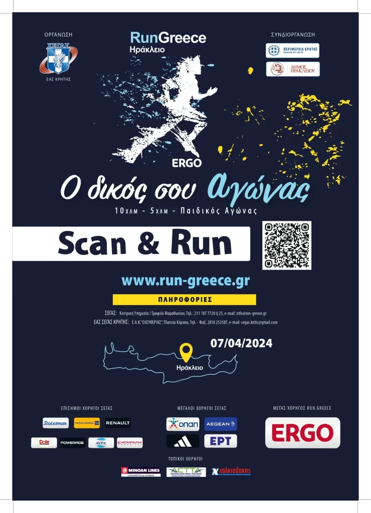 O Σ.Ε.Γ.Α.Σ. και η Ε.Α.Σ. Σ.Ε.ΓΑ.Σ. Κρήτης με συνδιοργανωτές την Περιφέρεια Κρήτης / Region of Crete και τον Δήμος Ηρακλείου – Municipality of Heraklion, μεγάλο χορηγό την ERGO Ασφαλιστική και τοπικούς χορηγούς τις Μινωικές Γραμμές, το Σύνδεσμο Τουριστικών και Ταξιδιωτικών Γραφείων Κρήτης και τα Super Market Χαλκιαδάκης, διοργανώνουν και φέτος τον αγώνα RUN GREECE ΗΡΑΚΛΕΙΟ την Κυριακή 7 Απριλίου 2024.