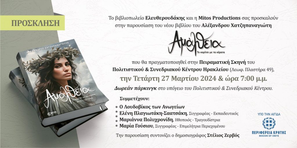 Διατίθεται ήδη στα βιβλιοπωλεία στην Ελλάδα και σύντομα και της Κύπρου. Η επίσημη παρουσίαση του βιβλίου «Αμάλθεια» θα γίνει από το βιβλιοπωλείο Ελευθερουδάκης και τη ΜΙΤΟΣ, στο Πολιτιστικό Συνεδριακό Κέντρο Ηρακλείου, την Τετάρτη 27 Μαρτίου 2024, στις 19:00.