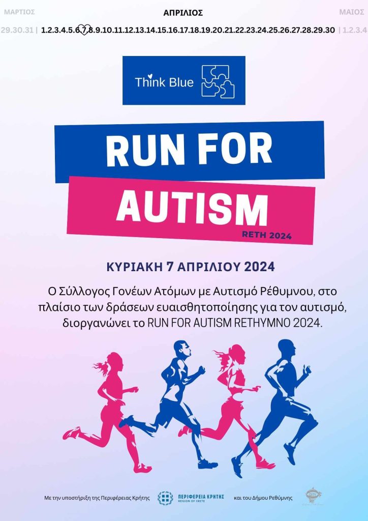 Περιφερειακής Ενότητας Ρεθύμνου και την υποστήριξη του Δήμου Ρεθύμνου, διοργανώνει στα πλαίσια της Παγκόσμιας Ημέρας Ευαισθητοποίησης για τον Αυτισμό, το πρωί της Κυριακής 07 Απριλίου 2024, στην Πλατεία Αγνώστου Στρατιώτη, 4 αγώνες δρόμου για αθλητές, μη αθλητές και παιδιά.