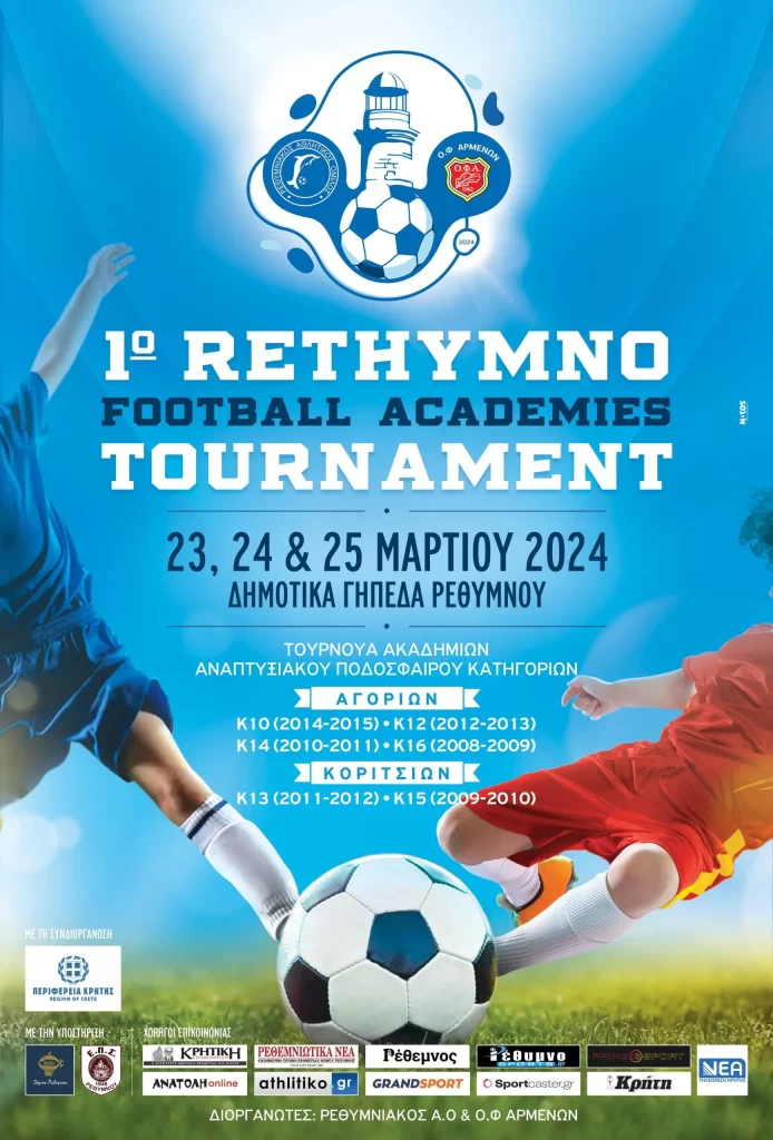Έναρξη Σάββατο 23 Μαρτίου 2024 του «1ου Rethymno Football Academies Tournament» που διοργανώνουν το τριήμερο 23-25 Μαρτίου τα σωματεία ΡΕΘΥΜΝΙΑΚΟΣ ΑΟ & ΟΦ ΑΡΜΕΝΩΝ, με συνδιοργανώτρια την ΠΕΡΙΦΕΡΕΙΑ ΚΡΗΤΗΣ και την υποστήριξη του ΔΗΜΟΥ ΡΕΘΥΜΝΟΥ και της ΕΠΣ ΡΕΘΥΜΝΟΥ.