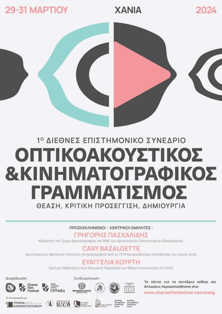 Το Φεστιβάλ Κινηματογράφου Χανίων διοργανώνει, στις 29, 30 και 31 Μαρτίου 2024, στα Χανιά το 1ο Διεθνές Επιστημονικό Συνέδριο με Διεθνή Συμμετοχή με τίτλο “Οπτικοακουστικός & Κινηματογραφικός Γραμματισμός. Θέαση – Κριτική προσέγγιση – Δημιουργία” στο Πνευματικό Κέντρο Χανίων.