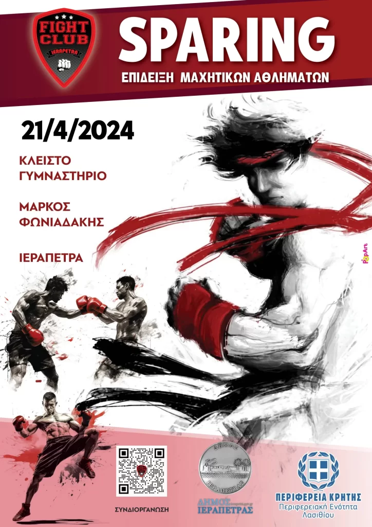 Ο Σκοπευτικός Όμιλος – Πολεμικές Τέχνες Ιεράπετρας οργανώνει εκδήλωση SPARING (Επίδειξη μαχητικών αθλημάτων) την Κυριακή 21 Απριλίου 2024 και ώρα 10π.μ. στο κλειστό γυμναστήριο «Μάρκος Φωνιαδάκης» στην Ιεράπετρα. Ο Αγώνας διεξάγεται με την συνδιοργάνωση της Περιφέρειας Κρήτης-ΠΕ Λασιθίου.