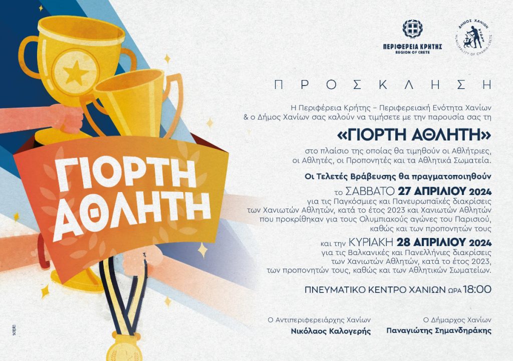 Η Περιφέρεια Κρήτης – Περιφερειακή Ενότητα Χανίων & ο Δήμος Χανίων διοργανώνουν, για άλλη μια χρονιά, τη «ΓΙΟΡΤΗ ΑΘΛΗΤΗ» στο πλαίσιο της οποίας θα τιμηθούν οι Αθλητές & οι Αθλήτριες, οι Προπονητές & οι Προπονήτριες, καθώς και τα Αθλητικά Σωματεία των Χανίων για τις διακρίσεις που πέτυχαν κατά το έτος 2023, σύμφωνα με τα στοιχεία που προσκόμισαν οι Ομοσπονδίες τους.