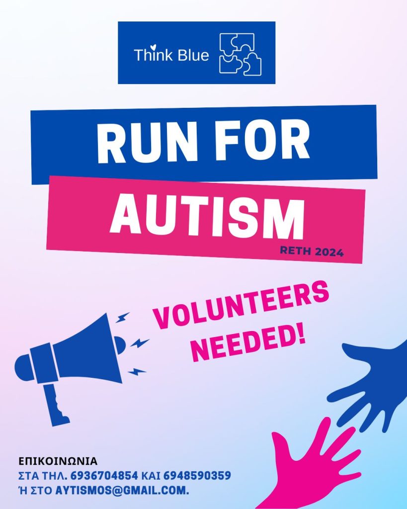 Ο Σύλλογος Γονέων Ατόμων με Αυτισμό Ρεθύμνου και ο Think Blue – Το μπλε του Αυτισμού στο Ρέθυμνο ψάχνει για ενθουσιώδεις και δραστήριους εθελοντές που θα βοηθήσουν να διασφαλιστεί η ομαλή διεξαγωγή του αγώνα, να στηρίξουν τους δρομείς και να ενισχύσουν το πνεύμα της εκδήλωσης.