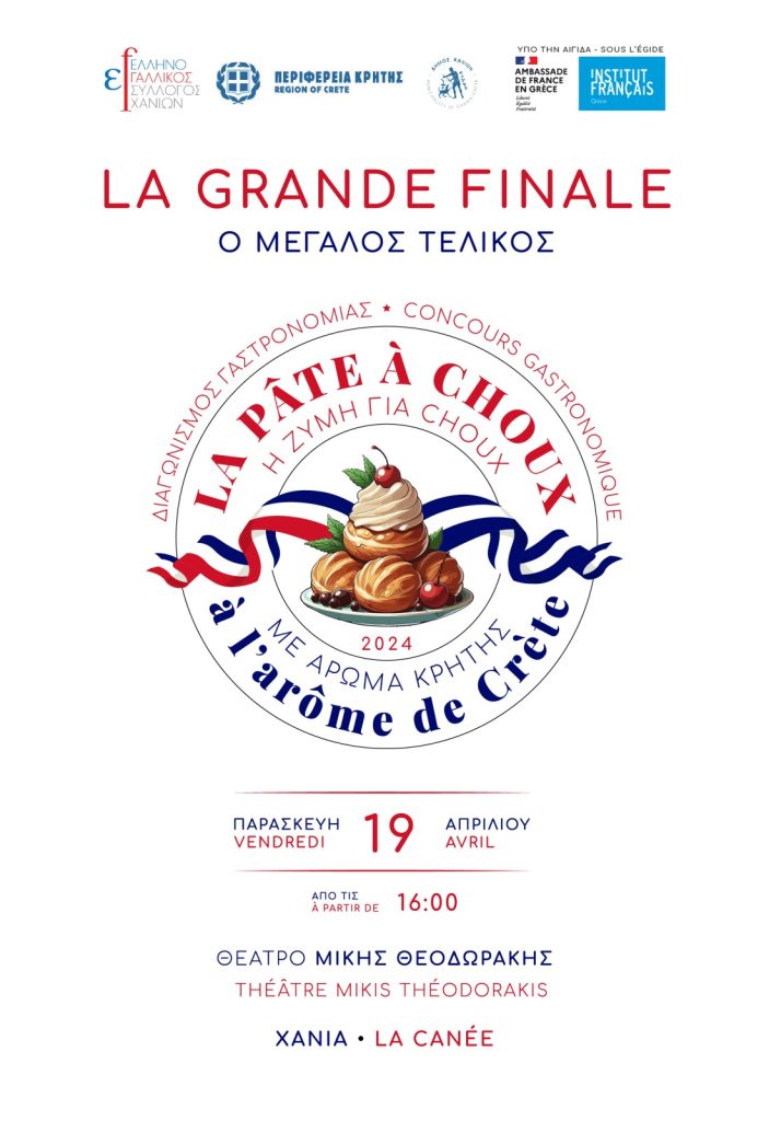 «La Grande Finale» ένα πάντρεμα δύο πολιτισμών: της Γαλλικής Γαστρονομίας και της Κρητικής Διατροφής. Ύστερα από τον επιτυχημένο πρώτο γύρο του Γαστρονομικού Διαγωνισμού «Pâte à choux με άρωμα Κρήτης», έρχεται ο Μεγάλος Τελικός που θα διεξαχθεί στις 19 Απριλίου 2024 στο Θέατρο Μίκης Θεοδωράκης με ώρα εκκίνησης στις 16:00 το απόγευμα.