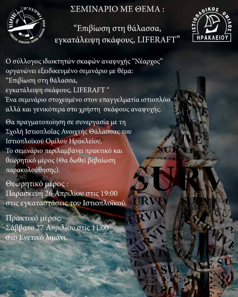 Θα πραγματοποιηθεί σε συνεργασία με την Σχολή Ιστιοπλοΐας Ανοιχτής Θάλασσας του Ιστιοπλοϊκού Ομίλου Ηρακλείου. Το σεμινάριο περιλαμβάνει πρακτικό και θεωρητικό μέρος (θα δοθεί βεβαίωση παρακολούθησης).