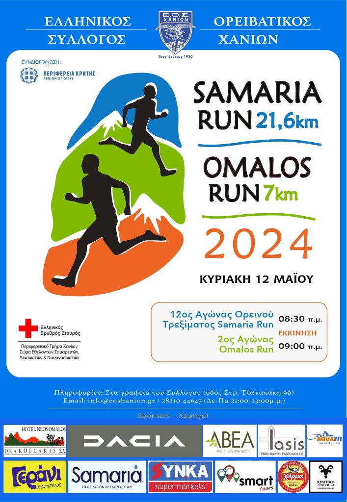 Ο Ελληνικός Ορειβατικός Σύλλογος Χανίων – ΕΟΣ Χανίων διοργανώνει την Κυριακή 12 Μαΐου 2024 τον 12ο Αγώνα Ορεινού Τρεξίματος «Σαμαριά» (SAMARIA RUN 2024) και τον 2ο Αγώνα Ορεινού Τρεξίματος «ΟΜΑΛΟΣ RUN» σε μια πανέμορφη μικρότερη βουνίσια διαδρομή μήκους 7 χιλιομέτρων με όμορφές εικόνες και θέα προς το οροπέδιο του Ομαλού και τα δυτικά Λευκά Όρη, με εκκίνηση το Οροπέδιο Ομαλού και τερματισμό στο Ξυλόσκαλο.