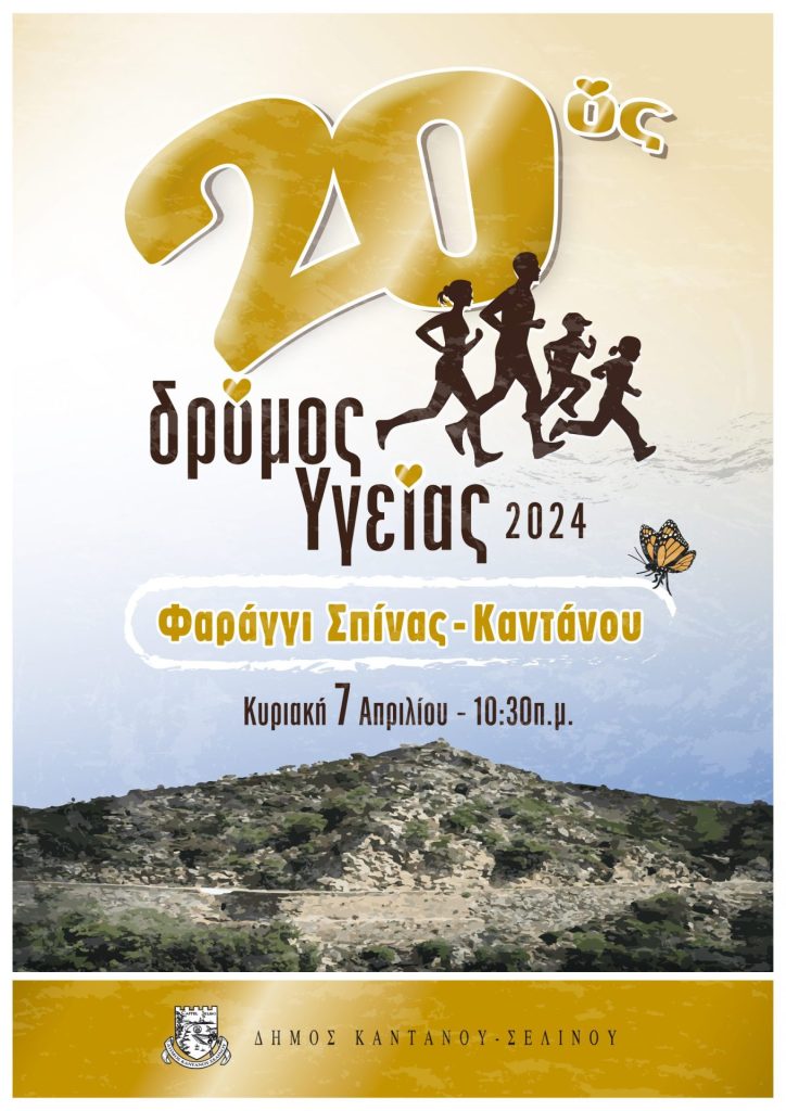 Ο πολιτισμός είναι ένα από τα δυνατά σημεία αυτού του τόπου και επενδύουμε σε αυτόν. Μαζί με την Πρωτοβάθμια και Δευτεροβάθμια Σχολική επιτροπή του Δήμου, με την καθηγήτρια Φυσικής Αγωγής Λιανού Ελένη και σε συνεργασία με τη Διεύθυνση Πρωτοβάθμιας και Δευτεροβάθμιας Εκπαίδευσης Χανίων, με αφορμή την Παγκόσμια Ημέρα Ολυμπισμού (6η Απριλίου) και την Παγκόσμια Ημέρα Υγείας (7η Απριλίου) διοργανώνετε ο «20ος Λαϊκός Δρόμος Υγείας 2024».