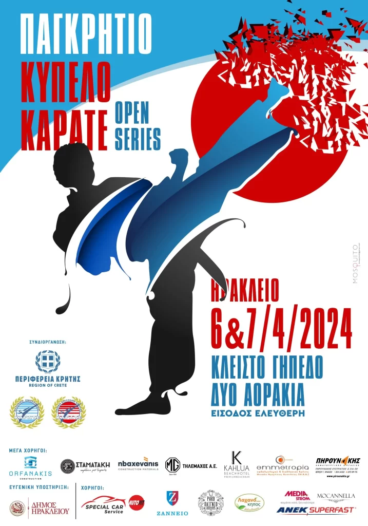 Η Ελληνική Ομοσπονδία Καράτε (ΕΛΟΚ) και η Ακαδημία Σοτοκάν Καράτε Ντο Ηρακλείου, με την στήριξη της Περιφέρειας Κρήτης, συνδιοργανώνουν το Παγκρήτιο κύπελλο καράτε έγχρωμων και μαύρων ζωνών καράτε Κρήτης «KARATE OPEN SERIES ΗΡΑΚΛΕΙΟ 2024» στις 6-7 Απριλίου 2024 στο Κλειστό Γυμναστήριο Αλικαρνασσού στα Δύο Αοράκια.