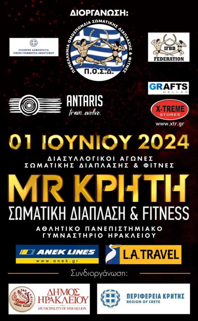 Η Πανελλήνια Ομοσπονδία Σωματικής Διάπλασης και Φίτνες και ο Αθλητικός Σύλλογος Ηρακλείου Ο Αντάρης συνδιοργανώνουν με την στήριξη της Περιφέρειας Κρήτης το Διασυλλογικό Πρωτάθλημα Σωματικής Διάπλασης (bodybuilding) & fitness, με την ονομασία “Μr ΚΡΗΤΗ”.