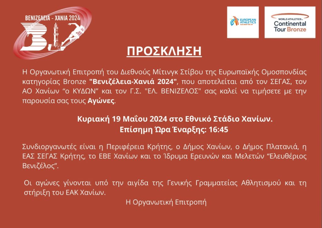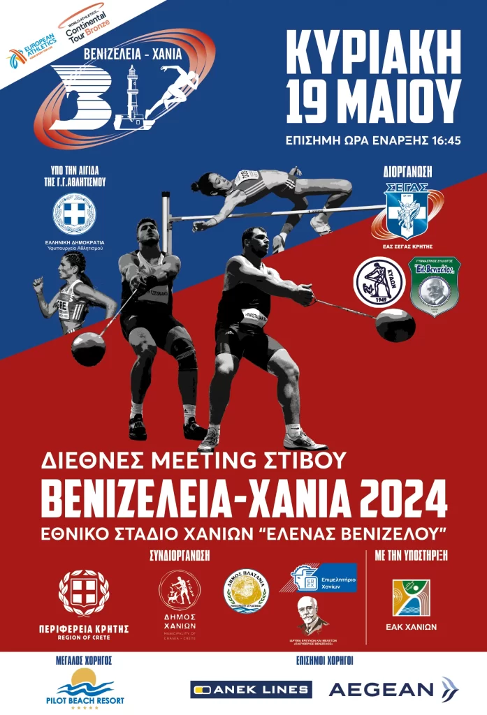 Στο διεθνές μίτινγκ στίβου «Βενιζέλεια – Χανιά» που διοργανώνουν Α.Ο. Χανίων «ο Κύδων» και Γ.Σ. Ελ. Βενιζέλος, με την έγκριση του ΣΈΓΑΣ και συνδιοργανωτές: την Περιφέρεια Κρήτης, το Δήμο Χανίων, το Δήμο Πλατανιά, την Ε.Α.Σ. Σ.Ε.Γ.Α.Σ Κρήτης, το ΕΒΕ Χανίων, το ίδρυμα Ερευνών και Μελετών «Ελευθέριος Βενιζέλος» και με την υποστήριξη του Ε.Α.Κ. Χανίων, αλλά και μεγάλου αριθμού φορέων, επιχειρήσεων και οργανισμών, οι πρωταθλητές από 27 χώρες θα προσφέρουν στους φιλάθλους του στίβου ένα εξαιρετικό θέαμα.