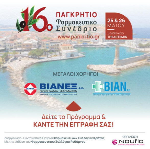 Το παλαιότερο, ιστορικότερο και με αδιάλειπτη επιτυχία φαρμακευτικό συνέδριο, το ΠΑΓΚΡΗΤΙΟ ΦΑΡΜΑΚΕΥΤΙΚΟ ΣΥΝΕΔΡΙΟ θα πραγματοποιηθεί το Σαββατοκύριακο 25 και 26 Μαΐου, στο ξενοδοχείο THEARTEMIS στο Ρέθυμνο.