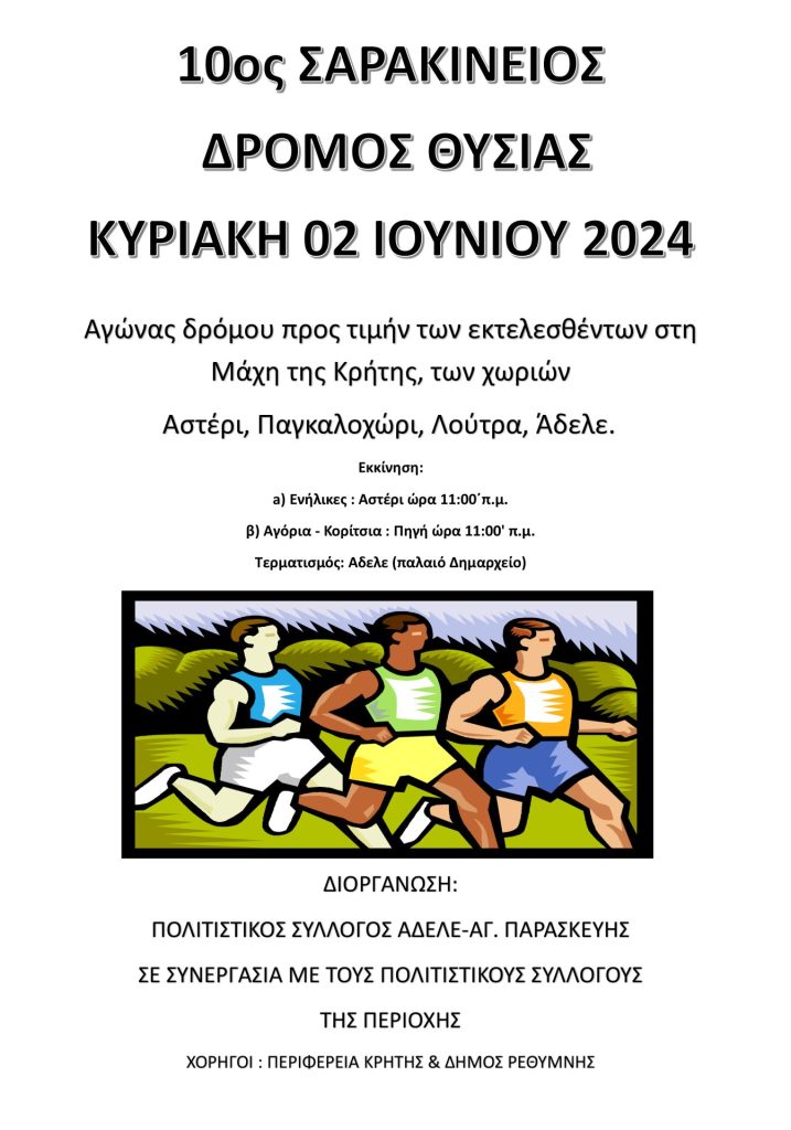 Ο Πολιτιστικός Σύλλογος Αδελε-Αγίας Παρασκευής, στα πλαίσια των εκδηλώσεων για την 83η επέτειο της εκτέλεσης των 18 συγχωριανών από τους Γερμανούς κατακτητές στη θέση Σαρακίνα, διοργανώνει τον 10ο Σαρακίνειο Αγώνα Δρόμου Θυσίας στην μνήμη των 18.