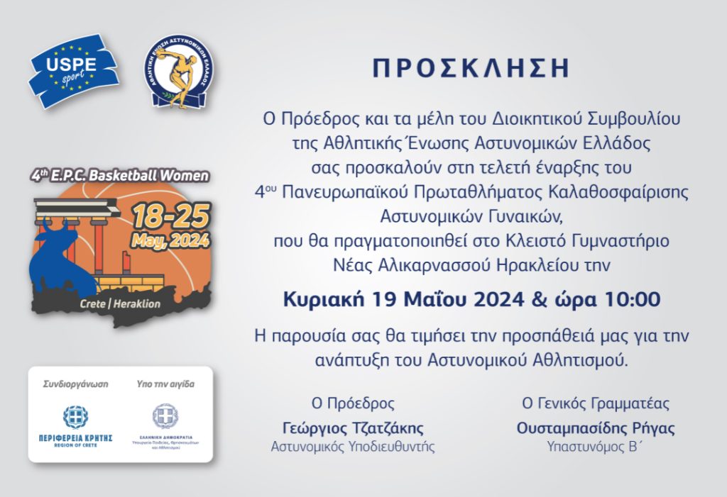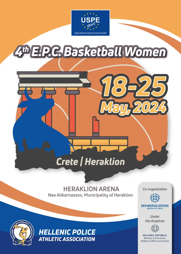 Η Ένωσή ανέλαβε τη διοργάνωση του 4ου Πανευρωπαϊκό Πρωταθλήματος Καλαθοσφαίρισης Αστυνομικών Γυναικών κατά το χρονικό διάστημα, 18-25 Μαΐου 2024. Ο τόπος τέλεσης του πρωταθλήματος θα είναι το Ηράκλειο Κρήτης και το κλειστό Γυμναστήριο Νέας Αλικαρνασσού καθόσον πληροί τις απαιτήσεις της Ευρωπαϊκής Αθλητικής Ένωσης Αστυνομιών (U.S.P.E.) και της Διεθνούς Ομοσπονδίας καλαθοσφαίρισης (F.I.B.A.).
