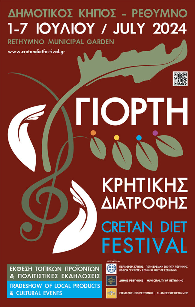 Ο Δήμος Ρεθύμνης, η Περιφερειακή Ενότητα Pεθύμνου και το Επιμελητήριο Ρεθύμνου όπως κάθε χρόνο, έτσι και φέτος πραγματοποιεί τη «Γιορτή Κρητικής Διατροφής / Cretan DIET Festival» από 1έως 7 Ιουλίου στον Δημοτικό Κήπο της πόλης.