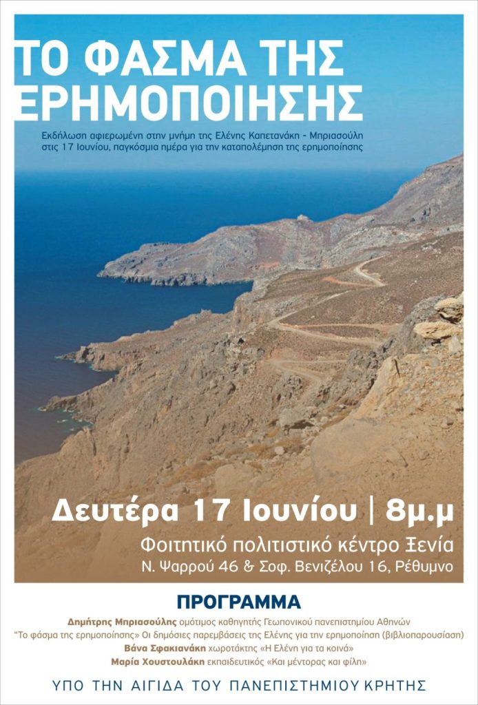 17η Ιουνίου Παγκόσμια Ημέρα για την Ερημοποίηση, από τον ΟΗΕ (Οργανισμός Ηνωμένων Εθνών) και στο πλαίσιο της ημέρας αυτής, το Πανεπιστήμιο Κρήτης πραγματοποιεί εκδήλωση μνήμης στην Ελένη Καπετανάκη -Μπριασούλη. Παρουσίαση του έργου της για την καταπολέμηση της ερημοποίησης.