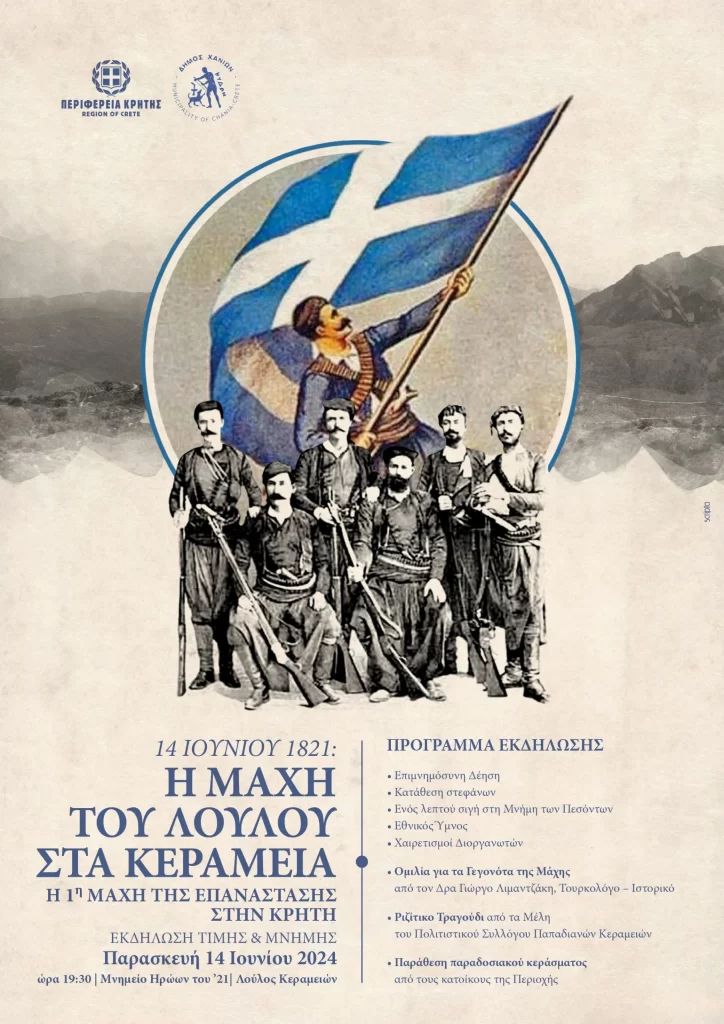 Η Περιφέρεια Κρήτης – Περιφερειακή Ενότητα Χανίων και ο Δήμος Χανίων διοργανώνουν εκδήλωση Τιμής και Μνήμης για την 1η Μάχη της Ελληνικής Επανάστασης στην Κρήτη, τη νικηφόρα Μάχη του Λούλου στα Κεραμειά, που έλαβε χώρα στις 14 Ιουνίου 1821 και γέμισε θάρρος και δύναμη τους Επαναστατημένους Κρητικούς.