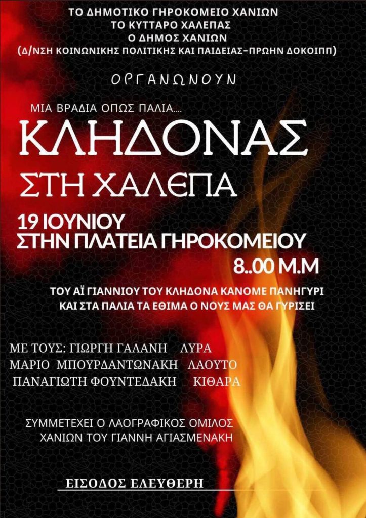 O Αθλητικός Πολιτιστικός Σύλλογος “ΚΥΤΤΑΡΟ ΧΑΛΕΠΑΣ”, το Δημοτικό Γηροκομείο Χανίων και ο Δήμος Χανίων (Δ/ΝΣΗ Κοινωνικής Πολιτικής και Παιδείας- πρώην ΔΟΚΟΙΠΠ) σας προσκαλούν στην εκδήλωση «Αναβίωση εθίμου του Κλήδονα – Κρητικό Γλέντι» την Τετάρτη 19 Ιουνίου 2024 και ώρα 20:00 στην Πλατεία Γηροκομείου, στη Χαλέπα.