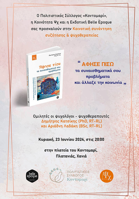 Σε συνέχεια της περυσινής συνάντησης με τον ψυχολόγο-ψυχοθεραπευτή Δημήτρη Κατσίκη (Phd, RT-RL), ανανεώνουμε το ραντεβού και αυτό το καλοκαίρι στην πλατεία του χωριού για μία “Κοινοτική Συνάντηση Συζήτησης και Ψυχοθεραπείας”.