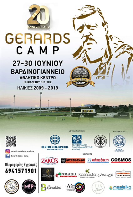 Το επετειακό GERARDS CAMP το οποίο κλείνει φέτος 20 χρόνια, θα πραγματοποιηθεί από 27 έως 30 Ιουνίου 2024 στο Βαρδινογιάννειο Αθλητικό Κέντρο με την υποστήριξη της Περιφέρειας Κρήτης και της ΠΑΕ ΟΦΗ, υπό την αιγίδα της ΕΠΣ Ηρακλείου.