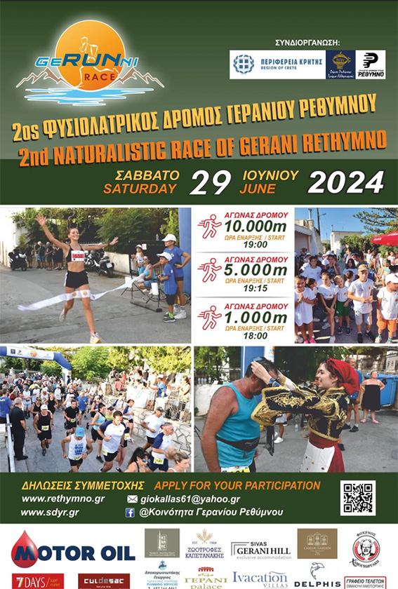 Η κοινότητα Γερανίου, ο Πολιτιστικός Σύλλογος Γερανίου, η ποδοσφαιρική ομάδα Γερανίου ΠΟΣΕΙΔΩΝΑΣ και οι εθελοντές Γερανίου με την υποστήριξη της Περιφέρειας Κρήτης, του τμήματος Αθλητισμού Δήμου Ρεθύμνου και του Συλλόγου Δρομέων Υγείας Ρεθύμνου, διοργανώνουν τον 2ο φυσιολατρικό αγώνα δρόμου 1, 5 και 10 χιλιομέτρων, GERANI RACE , που θα διεξαχθεί το Σάββατο 29 Ιουνίου 2024 στο Γεράνι, με αφετηρία και τερματισμό, την κεντρική πλατεία του χωριού και εντός του αύλειου χώρου της εκκλησίας του Αγίου Γεωργίου.