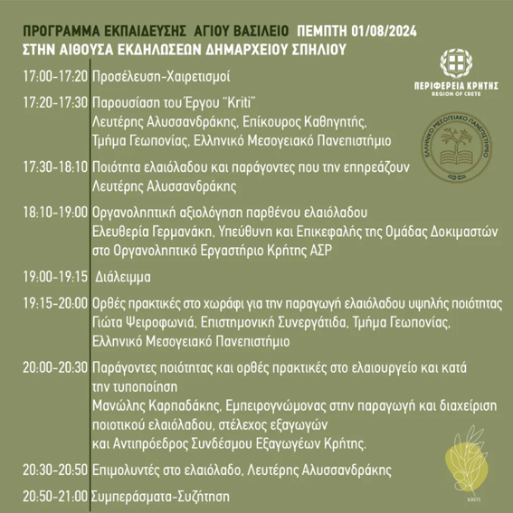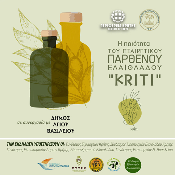 Η Περιφέρεια Κρήτης και το Ελληνικό Μεσογειακό Πανεπιστήμιο, σε συνεργασία με το Δήμο Αγίου Βασιλείου, διοργανώνουν εσπερίδα για την ποιότητα του Εξαιρετικού Παρθένου Ελαιόλαδου “Kriti” η οποία θα πραγματοποιηθεί την Πέμπτη 1 Αυγούστου 2024, στις 17:00μ.μ., στην αίθουσα εκδηλώσεων στο δημαρχείο Σπηλίου.