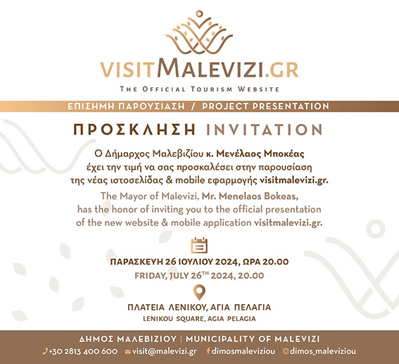 Η παρουσίαση της διαδικτυακής πύλης τουρισμού VisitMalevizi και της εφαρμογής για κινητά τηλέφωνα θα ξεκινήσει στις 20.00 την Παρασκευή 26 Ιουλίου 2024 στην πλατεία Λενικού της Αγίας Πελαγίας. 🖋