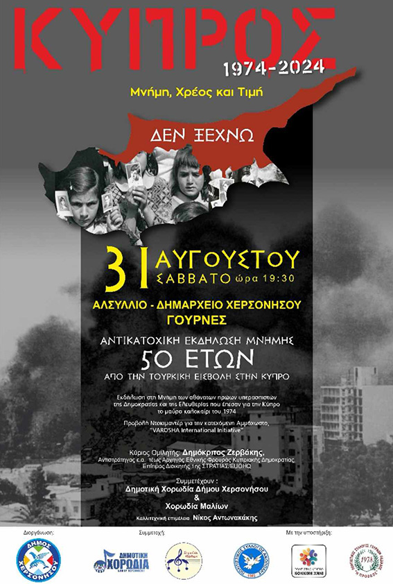 Εκδήλωση τιμής και μνήμης για τους πεσόντες ήρωες της Κύπρου, στο πλαίσιο των εκδηλώσεων που πραγματοποιούνται με αφορμή τη συμπλήρωση 50 χρόνων από το καλοκαίρι του 1974 και την τουρκική εισβολή, υλοποιεί ο Δήμος Χερσονήσου.