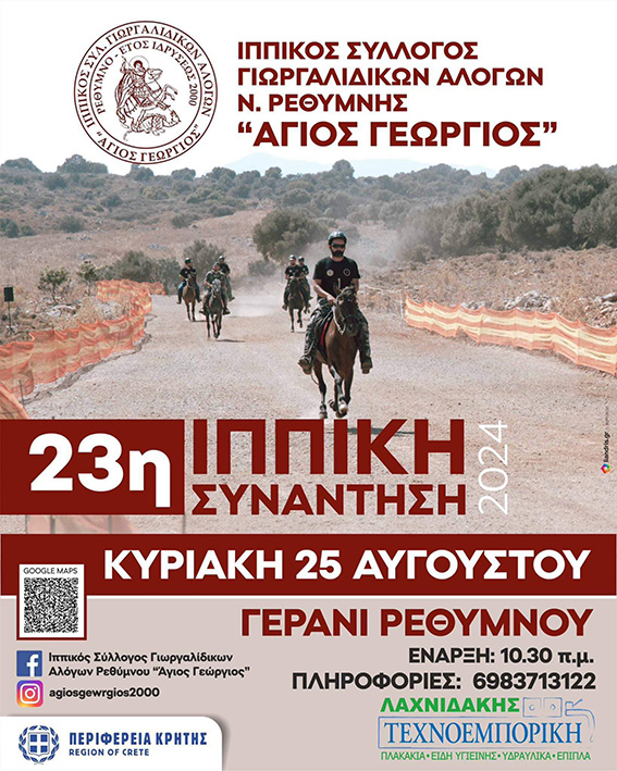 Άλλη μια όμορφη εκδήλωση πραγματοποιήθηκε στις 25/8, μία διοργάνωση από τον Ιππικός Σύλλογος Γιωργαλίδικων Αλόγων Ρεθύμνου “Άγιος Γεώργιος” που στέφθηκε με απόλυτη επιτυχία.