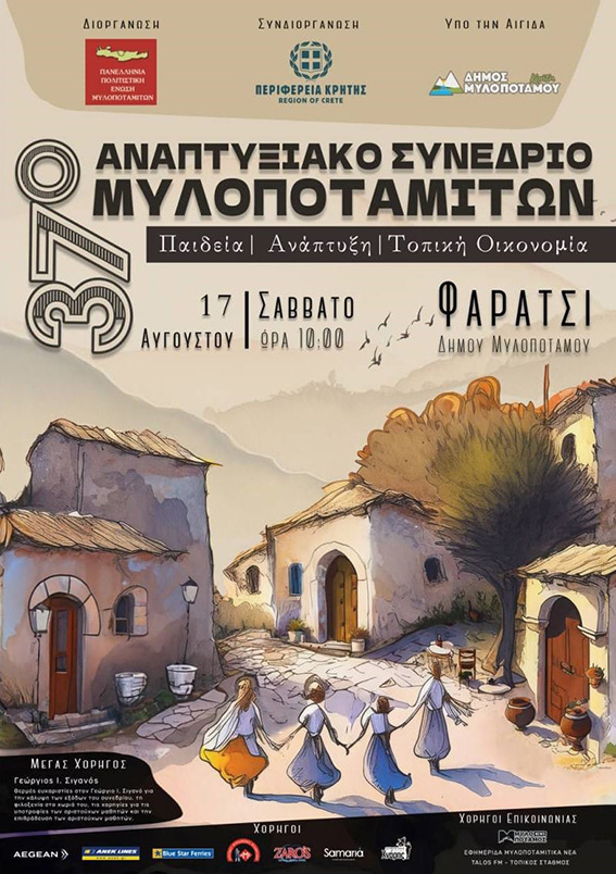 Η «Πανελλήνια Πολιτιστική Ένωση Μυλοποταμιτών», με τη στήριξη της Περιφέρειας Κρήτης και υπό την αιγίδα του Δήμου Μυλοποτάμου, πραγματοποιεί το 37ο Αναπτυξιακό Συνέδριο Μυλοποταμιτών το Σάββατο 17 Αυγούστου 2024 και ώρα 10.00, στο χωριό Φαράτσι της Κοινότητας Γαράζου, του Δήμου Μυλοποτάμου. Το συνέδριο διεξάγεται με τη συμβολή και τη στήριξη του Φαρατσανού επιχειρηματία στην Αμερική Γιώργου Σιγανού (Μέγας Χορηγός Συνεδρίου).