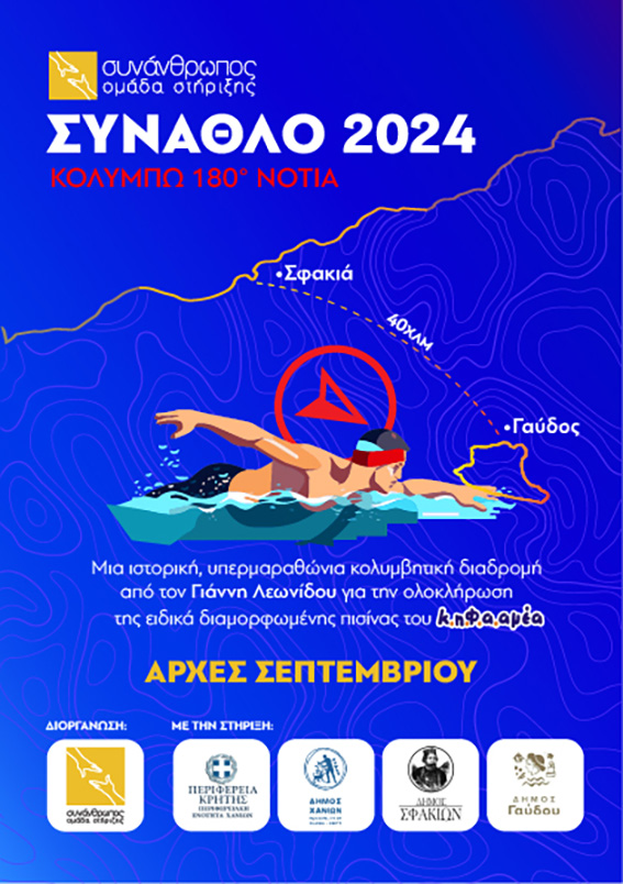 Συγκεκριμένα, πρόκειται για την απαιτητική θαλάσσια διαδρομή 40 χιλιομέτρων / 22 μιλίων από τα Σφακιά ως τη Γαύδο. Ο αθλητής πέραν της επίτευξης του απαιτητικού εγχειρήματος, επιδιώκει να κατακτήσει έναν ακόμη μεγαλύτερο στόχο από την ίδια τη διαδρομή: την ολοκλήρωση ειδικά διαμορφωμένης πισίνας για τις ανάγκες του Κ.Η.Φ.Α.ΑΜΕΑ Χανίων. Σε αυτή την προσδοκία, που κυοφορείται χρόνια, συναντήθηκε το όραμα του αθλητή και της Ομάδας Στήριξης Συνάνθρωπος, οι οποίοι αναγνωρίζοντας την επιτακτική ανάγκη αξιοποίησης του υγρού στοιχείου στις θεραπείες και στην ανακούφιση των μελών της δομής, αποφάσισαν πως ήρθε η ώρα να γεννηθεί!