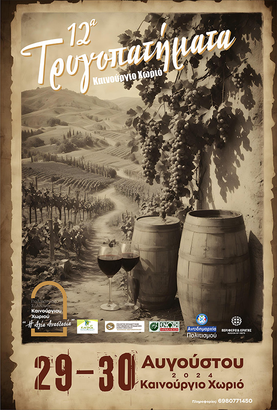 Ο Πολιτιστικός Σύλλογος Καινούργιου Χωριού «Αγία Αναστασία», για 12η χρονιά, οργανώνει τον θεσμό «ΤΡΥΓΟΠΑΤΗΜΑΤΑ» με ένα διήμερο δράσεων που περιλαμβάνει τον τρύγο στο αμπέλι με παραδοσιακό κολατσιό, το πάτημα των σταφυλιών για την παραγωγή του μούστου, την αποθήκευση των στράφυλων, εσπερίδα ανάγνωσης κρητικής αναγεννησιακής λογοτεχνίας, κέρασμα – γευσιγνωσία οίνου και παραδοσιακό γλέντι!