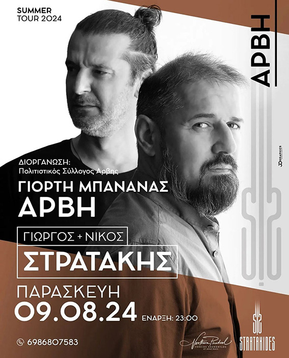- Κρητική βραδιά με το συγκρότημα του Γιώργου και Νίκου Στρατάκη. Ώρα έναρξης: 23:00 – Είσοδος: 15€ (πλήρες μενού) – Τηλ. κρατήσεων: 6986807583