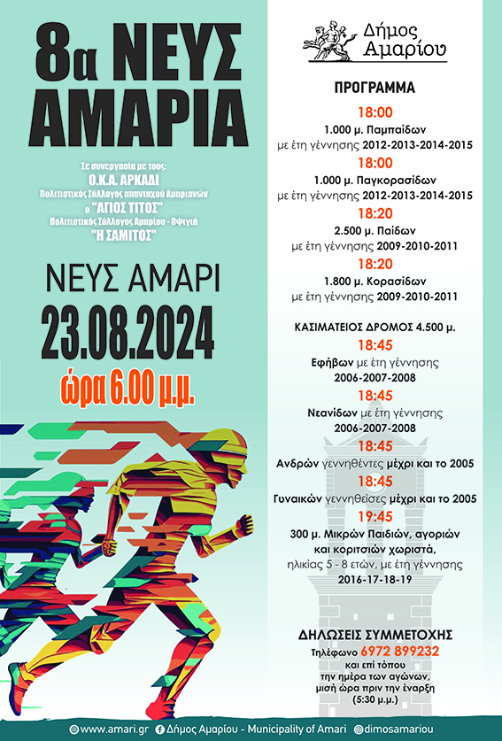 Ο Δήμος Αμαρίου, σε συνεργασία με τον Πολιτιστικό Σύλλογο απανταχού Αμαριανών «Άγιος Τίτος», τον Πολιτιστικό Σύλλογο Αμαρίου – Οψιγιά «Η Σαμιτός» και τον Ο.Κ.Α. Αρκάδι, ανακοινώνει με μεγάλη χαρά τη διοργάνωση των αγώνων δρόμου «8α ΝΕΥΣΑΜΑΡΙΑ» την Παρασκευή, 23 Αυγούστου 2024. Η εκδήλωση θα λάβει χώρα στο πανέμορφο Νευς Αμάρι και εντάσσεται στο πλαίσιο των εορταστικών εκδηλώσεων προς τιμήν του Αγίου Τίτου.