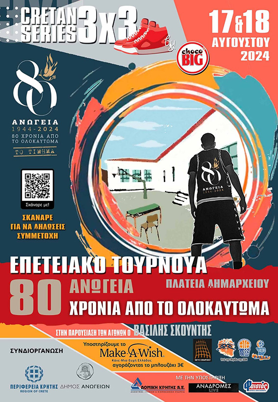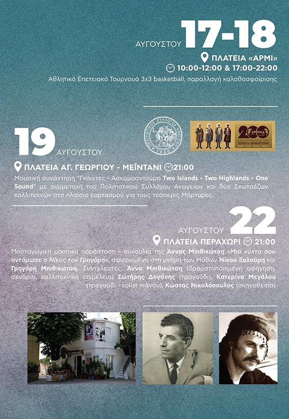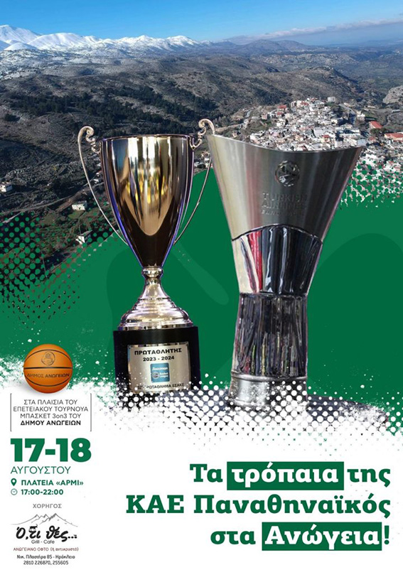 Αθλητικό Επετειακό Τουρνουά 3×3 basketball, παραλλαγή καλαθοσφαίρισης , πλατεία «Αρμί» 10:00-12:00 και 5:00-10:00. Επίσης τα δυο τρόπαια που κατέκτησε στην εφετινή σεζόν ο Παναθηναϊκός AKTOR και με γκεστ σταρ τον πρωταθλητή Ευρώπης και μέλος της Ολυμπιακής ομάδας, Πάνο Καλαϊτζάκη θα βρίσκονται στον χώρο για όλους/ες.