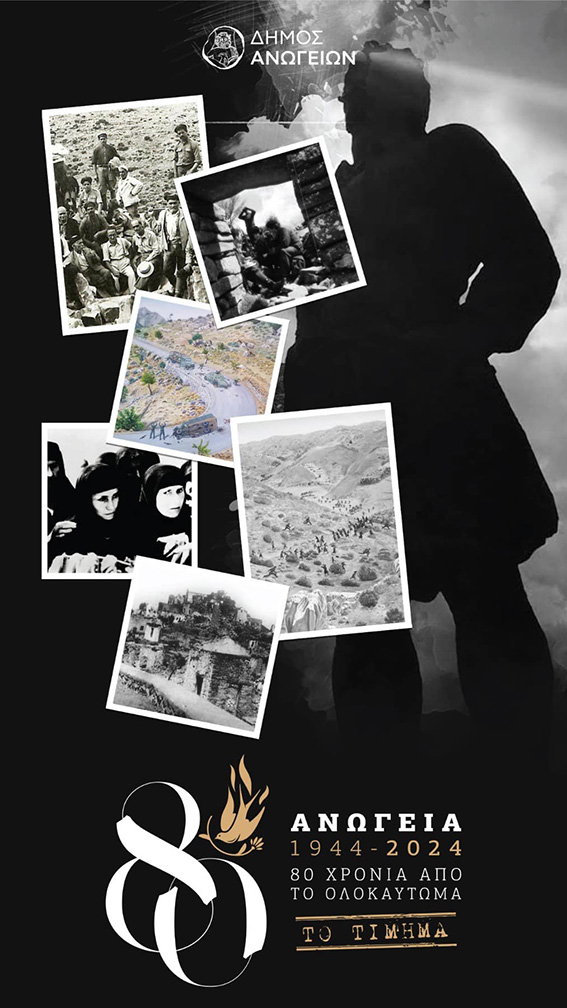 Φέτος, συμπληρώνονται 80 χρόνια από το Γ’ Ολοκαύτωμα των Ανωγείων και οι εκδηλώσεις στα Ανώγεια θα επικεντρωθούν στην επέτειο, στο «Tίμημα» του Ολοκαυτώματος, στην ζωή μετά, την λαϊκή και πολιτιστική δημιουργία. Οι πολιτιστικές εκδηλώσεις του Αυγούστου θα περιλαμβάνουν την 2η Έκθεση Λαϊκής Τέχνης του Δήμου Ανωγείων 2024, όπου θα προβληθεί το καλλιτεχνικό έργο νέων δημιουργών του τόπου μας. με τιμώμενο καλλιτέχνη, τον αείμνηστο Αλκιβιάδη Σκουλά (Γρυλιό).