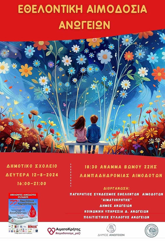 Εθελοντική Αιμοδοσία, Δημοτικό Σχολείο Ανωγείων, 16:00 – 21:00.
