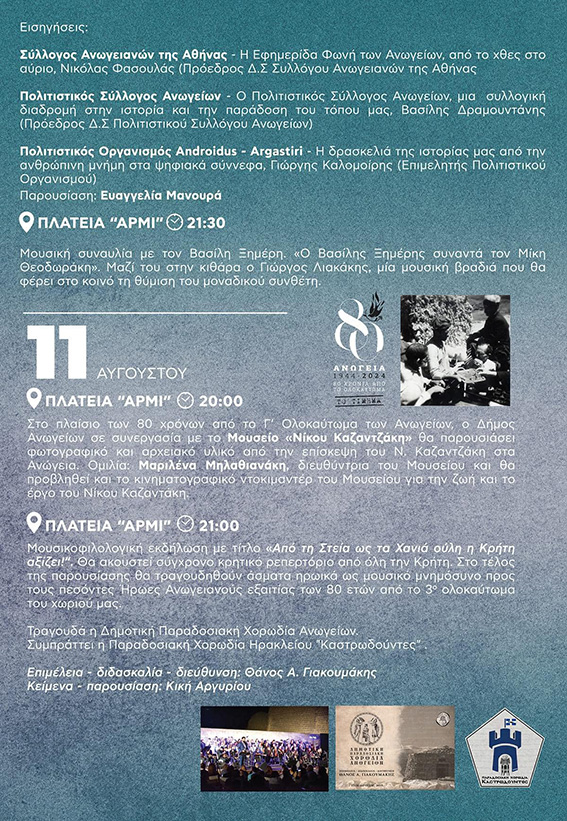Τραγουδά η Χορωδία Δήμου Ανωγείων, ενώ συμπράττει η παραδοσιακή Χορωδία Ηρακλείου «Καστρωδούντες». Επιμέλεια-διδασκαλία-διεύθυνση Θάνος Α. Γιακουμάκης. Κείμενα-Παρουσίαση Κική Αργυρίου, ώρα 9:00μ.μ πλατεία «Αρμί».