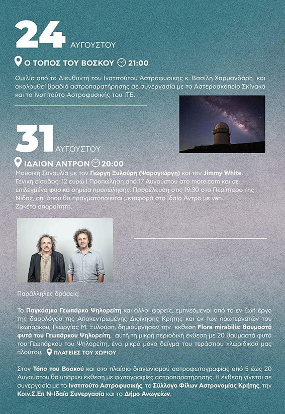 Ομιλία από τον Διευθυντή του Ινστιτούτου Αστροφυσικής Βασίλη Χαρμανδάρη και Βραδιά Αστροπαρατήρησης σε συνεργασία με το Αστεροσκοπείο του Σκίνακα και το Ινστιτούτο Αστροφυσικής του ΙΤΕ, «Τόπος του Βοσκού», ώρα 9:00μ.μ.