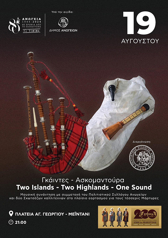 Μουσική συνάντηση Γκάιντες -Ασκομπαντούρα “two Islands-two Hihlands – OneSound” με συμμετοχή του Πολιτιστικού Συλλόγου Ανωγείων και δύο Σκωτσέζων καλλιτεχνών στο πλαίσιο εορτασμού για τους Τέσσερις Μάρτυρες, ώρα 9:00, πλατεία «Μειντάνι».
