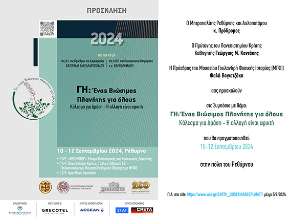 Το φλέγον ζήτημα της κλιματικής αλλαγής, η βιωσιμότητα και η αειφορία, θα τεθούν στο επίκεντρο του τριήμερου Οικολογικού Συμποσίου «ΓΗ: Ένας Βιώσιμος Πλανήτης για όλους – Κάλεσμα για Δράση – Η αλλαγή είναι εφικτή», που θα πραγματοποιηθεί στο Ρέθυμνο μεταξύ 10 και 12 Σεπτεμβρίου 2024.