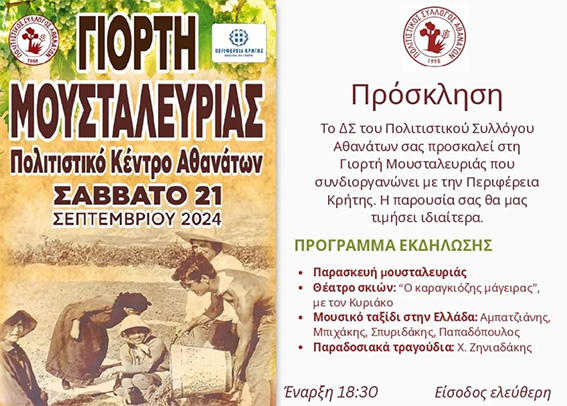 Ο Πολιτιστικός Σύλλογος Αθανάτων συνδιοργανώνει με την Περιφέρεια Κρήτης τη «Γιορτή Μουσταλευριάς» στις 21 Σεπτεμβρίου 2024 και ώρα 6:30 το απόγευμα στο Πολιτιστικό Κέντρο των Αθανάτων με ελεύθερη είσοδο για τους πολίτες.